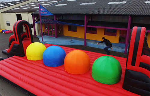 Découvrez le Maxi Wipeout, une attraction gonflable pleine de défis où les participants doivent s’élancer depuis une plateforme et sauter de boule en boule pour atteindre le mur d’arrivée le plus rapidement possible.